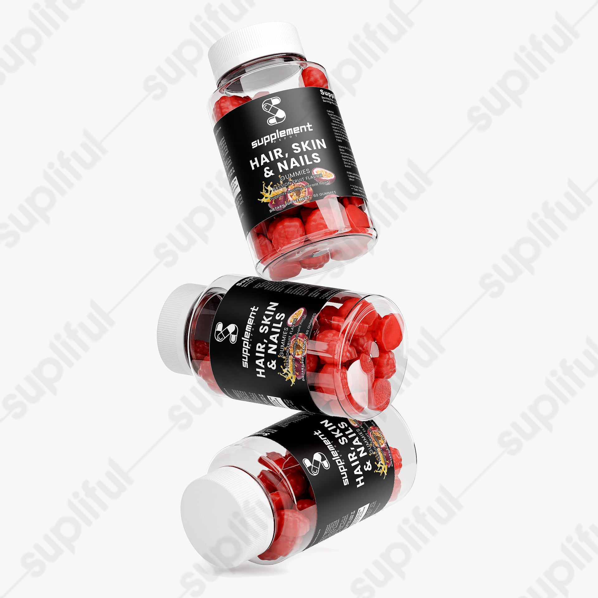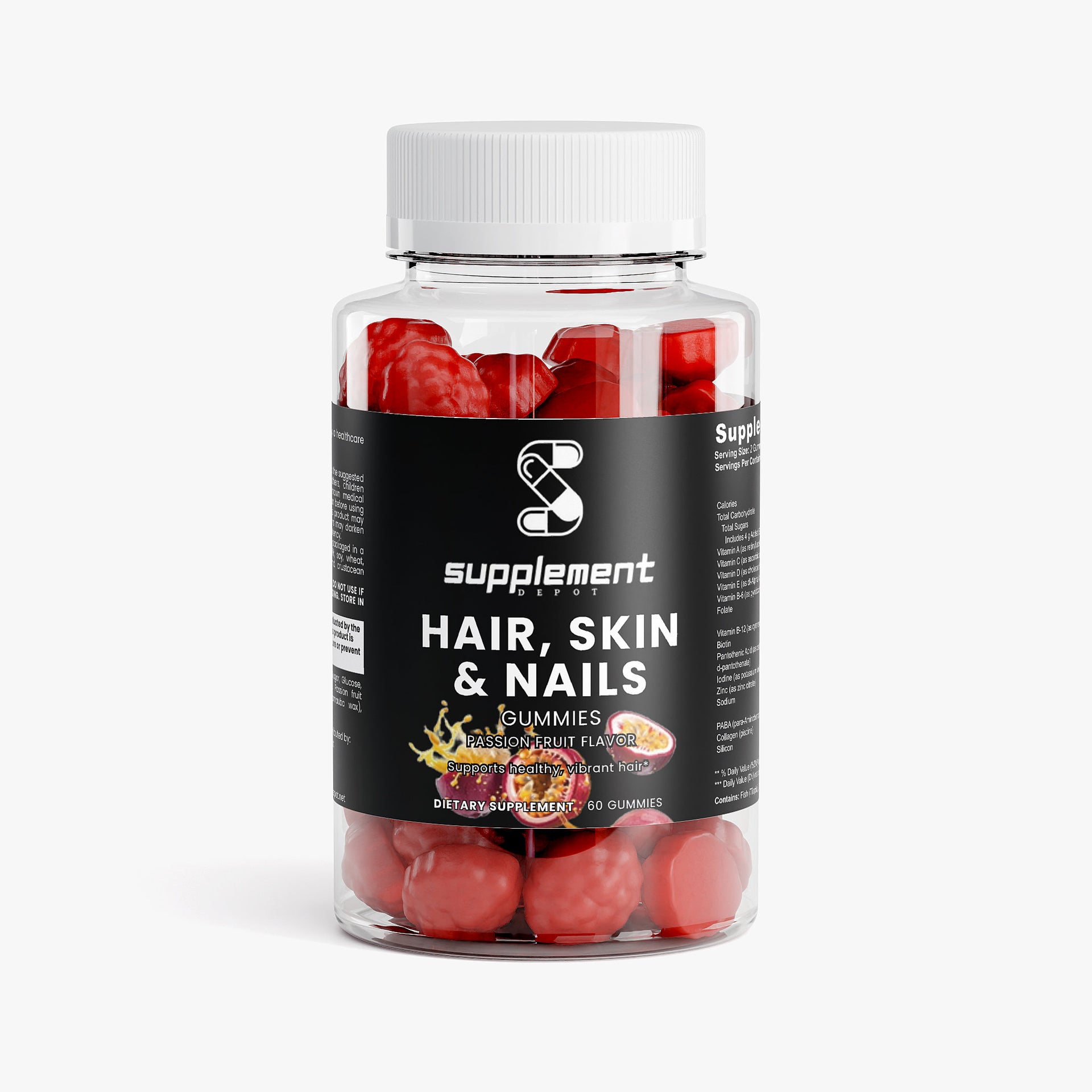 Ingredients: Vitamin A (as retinyl acetate), Vitamin C (as ascorbic acid), Vitamin D (as cholecalciferol), Vitamin E (as dl-Alpha tocopheryl acetate), Vitamin B-6 (as pyridoxine HCI), Folate, Vitamin B-12 (as cyanocobalamin), Biotin, Pantothenic Acid (as calcium d-pantothenate), Iodine (as potassium iodide), Zinc (as zinc citrate), PABA (para-Aminobenzoic Acid), Collagen (piscine), Silicon, Glucose syrup, Sugar, Glucose, Pectin, Citric acid, Sodium citrate, Passion fruit flavor, Vegetable oil (contains carnauba wax), Purple carrot juice concentrate.
